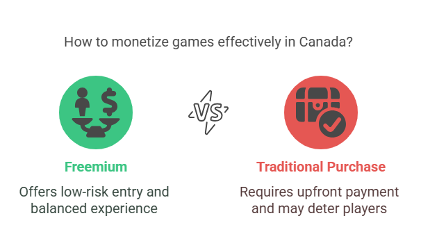 The freemium model, one where the game is free to play but extra features are charged for, is a much-preferred way to monetize in Canada. Canadian gamers have a preference for low-risk entry, something the freemium model gives them. Usually, the developer markets IAPs for cosmetic upgrades, in-game currency, or speedier advancement so players can opt not to purchase anything unless they find value in it.